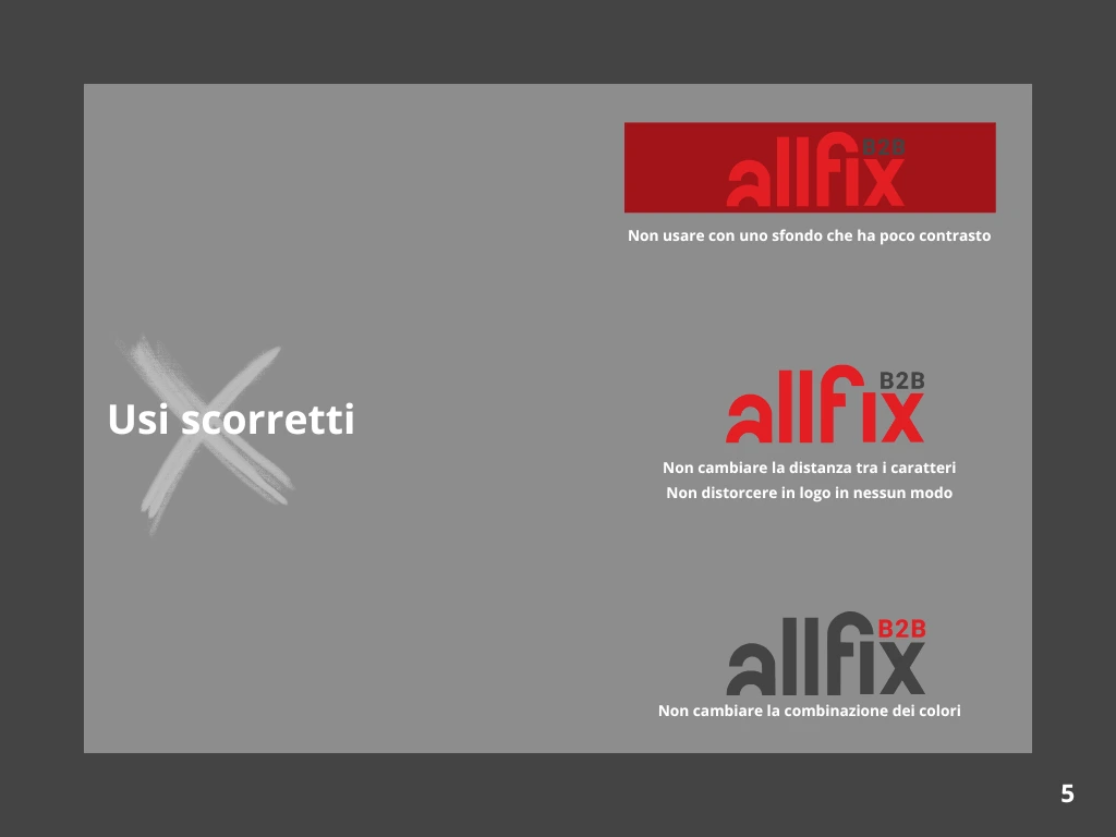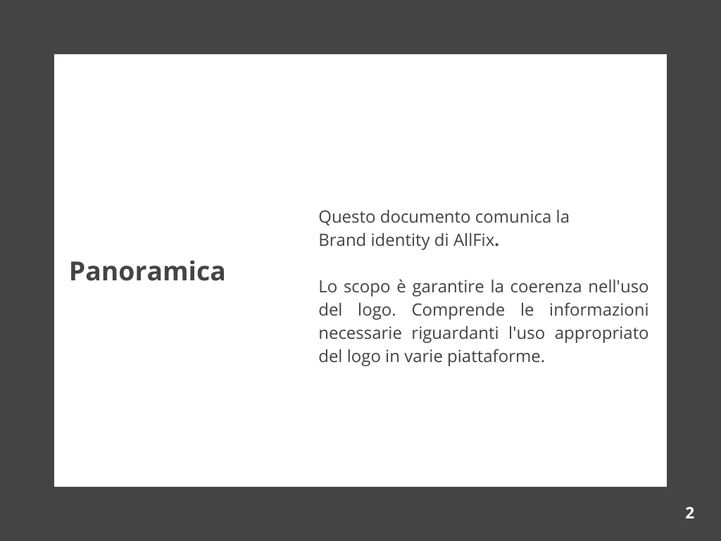 Manuale della brand identity per Allfix B2B, produttore leader di soluzioni di fissaggio. Il documento definisce l’identità visiva e i valori del marchio, fornendo regole chiare sull’uso di logo, colori, tipografia e tono di comunicazione, per garantire coerenza e riconoscibilità in ogni punto di contatto, online e offline.